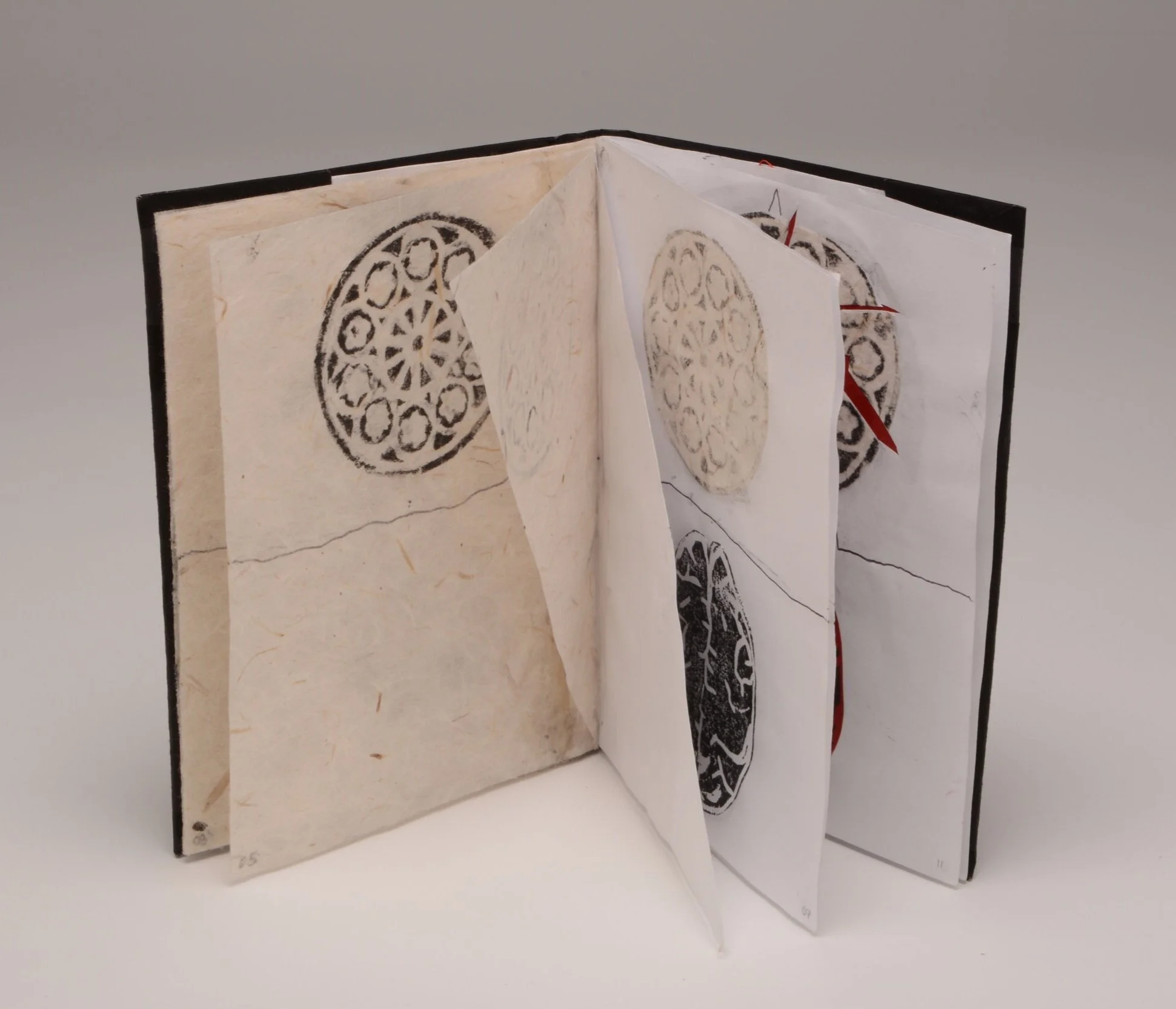 Materials: Handmade paper, machined paper, block prints, a mess of red thread